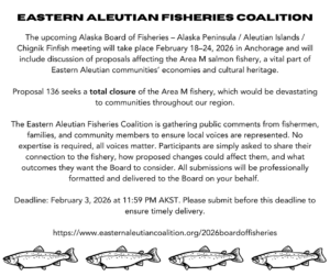Public Comment on the Alaska Board of Fish Meeting for February 2026 can be submitted by following the link below. Proposals have been submitted that would carry a significant impact to the Area M fishery, if you have testimony you would like the Board to hear submit your testimony by February 3rd.