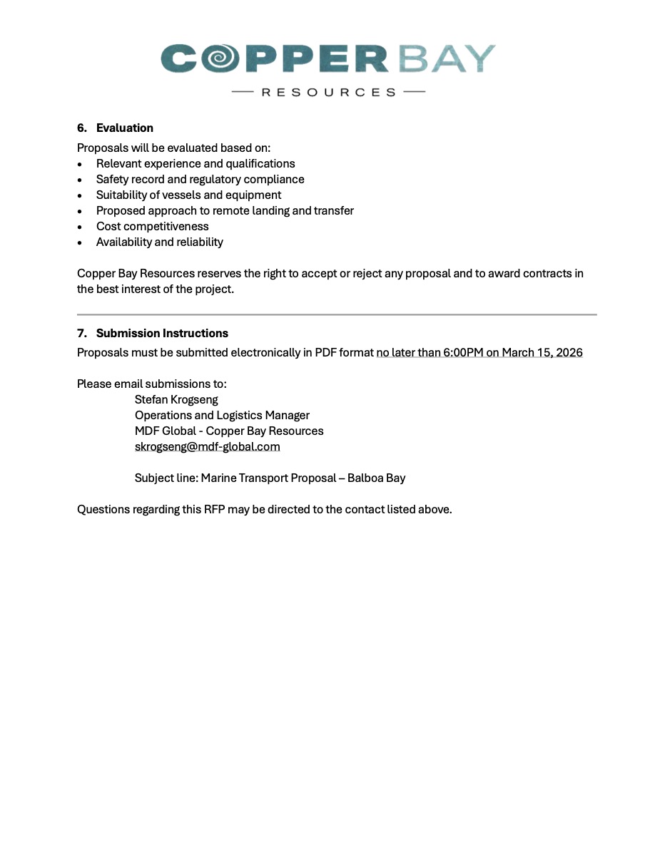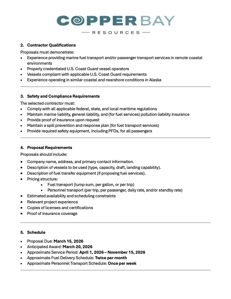 PDF: Copper Bay Mining Request for Proposals (RFP) Posted by General Manager | 2026-03-02 | Community Window, Employment Opportunity, KSDP Programs CBR – Marine Transport RFP (002)